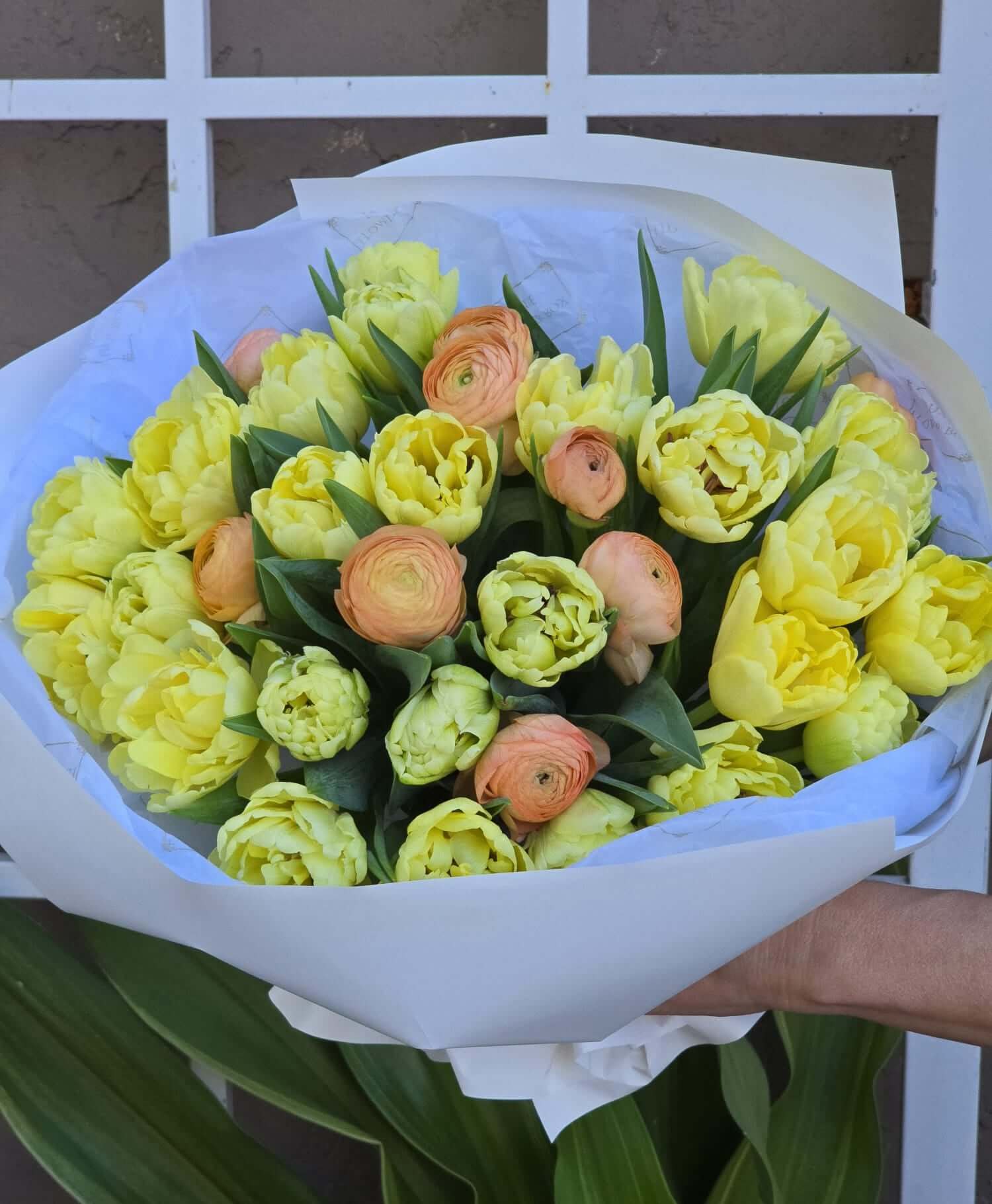 A stunning floral arrangement featuring lush double peony tulips paired with delicate peach ranunculus. The double-layered tulip petals create a voluminous, romantic look, while the soft, ruffled ranunculus adds elegance and charm. Perfect for any occasion, this bouquet embodies beauty and sophistication.