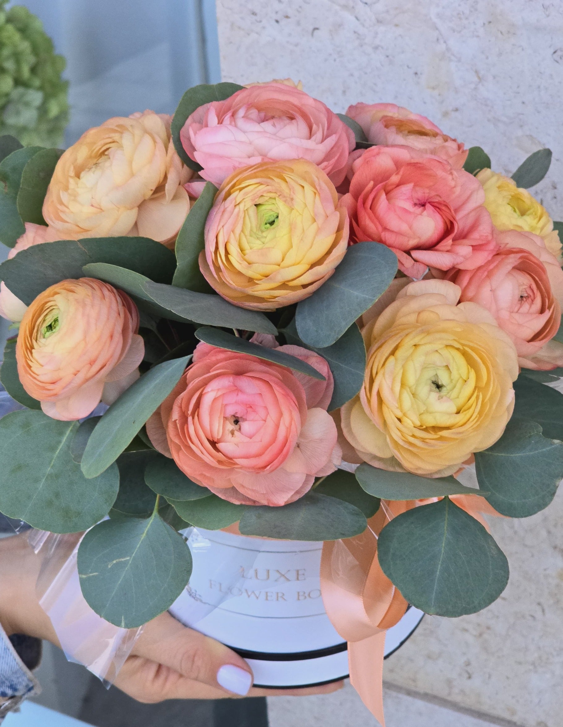 peach ranunculus eucalyptus flower box – Elegant Gift